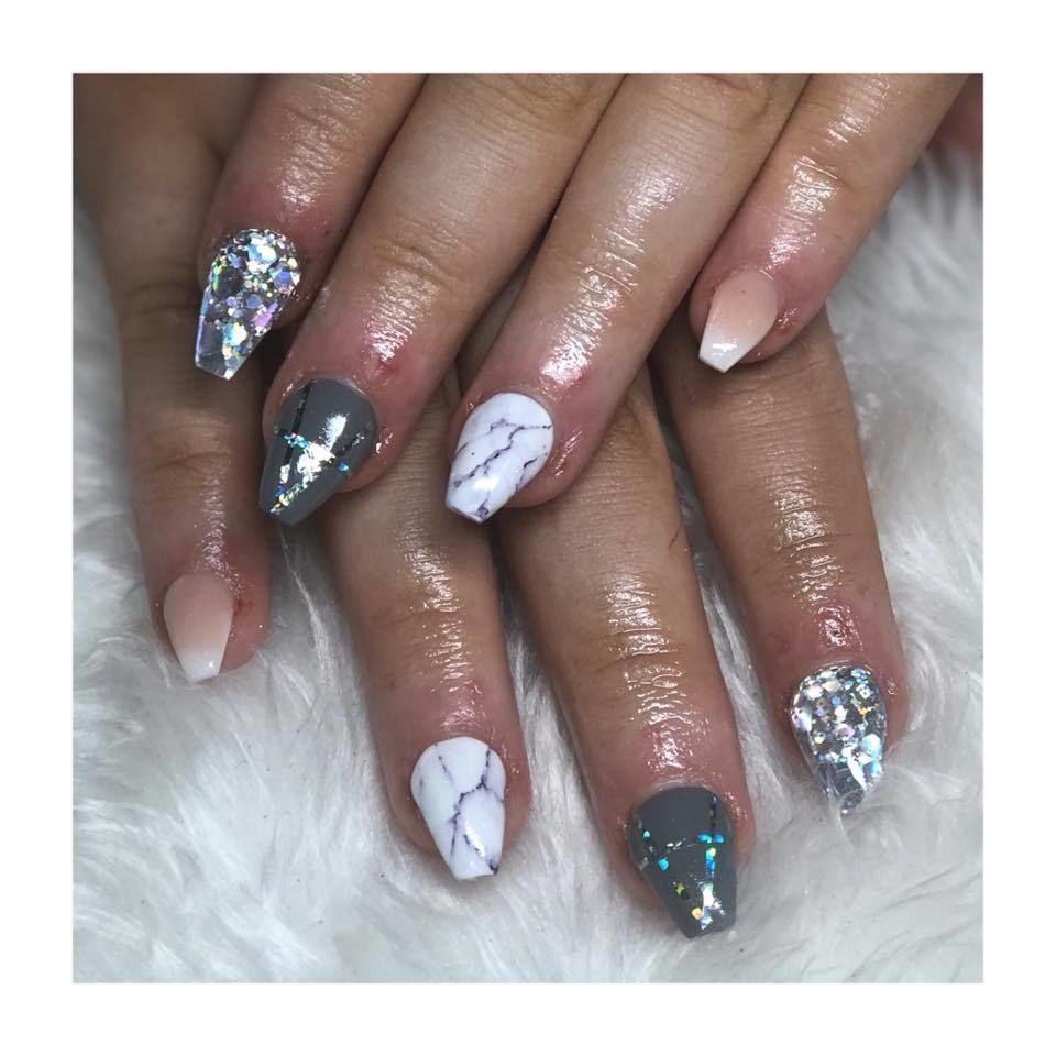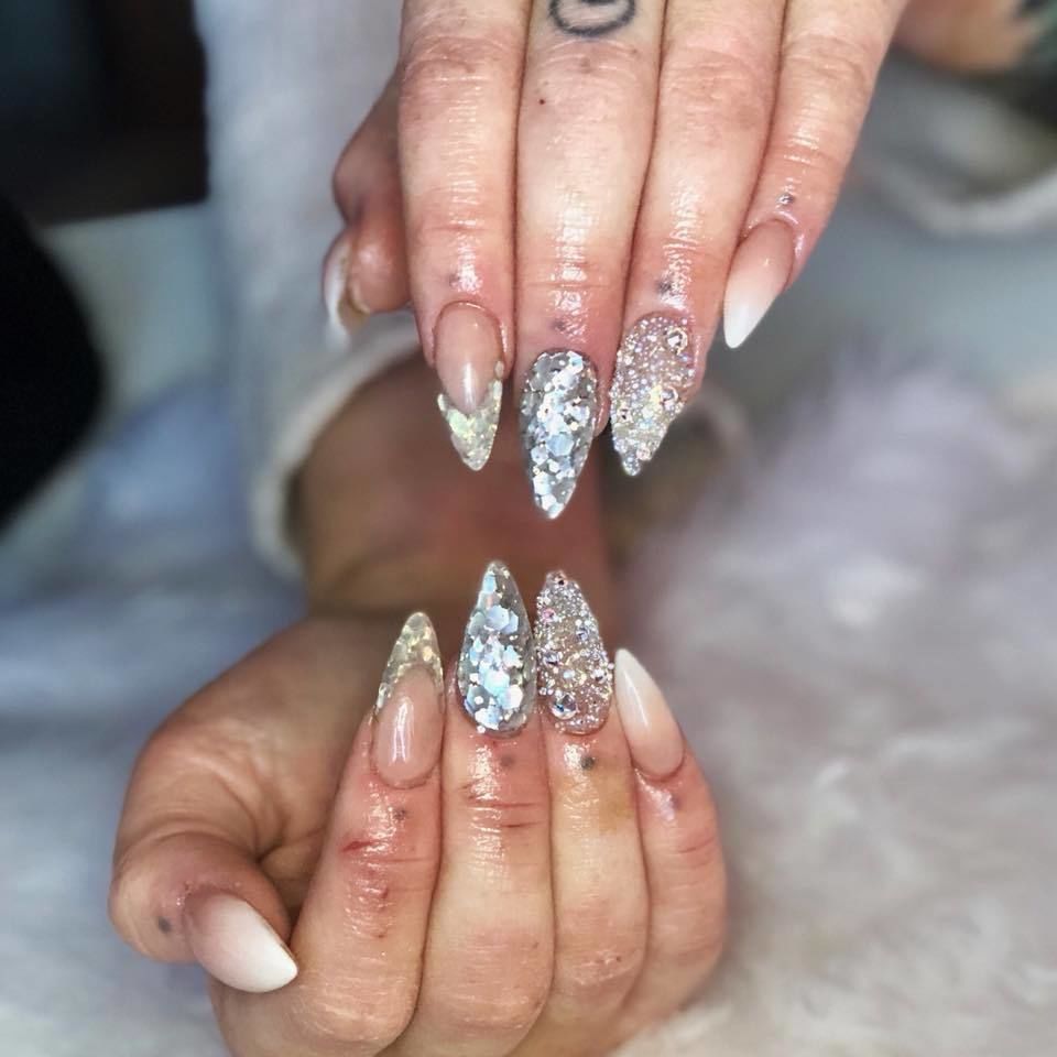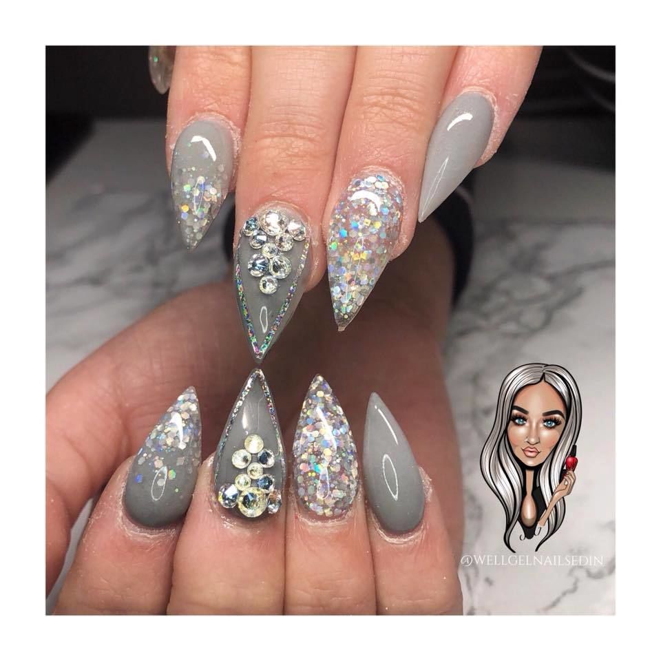 Pretty grey set for my little hunny @shannonhenderson7 ♀️✨ #greynails #silvernails #glitternails #allpowder #nopolish #swarovskinails #edinburghnails